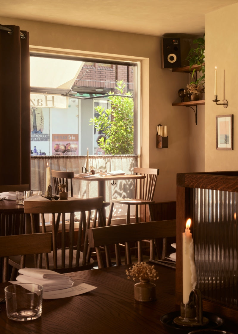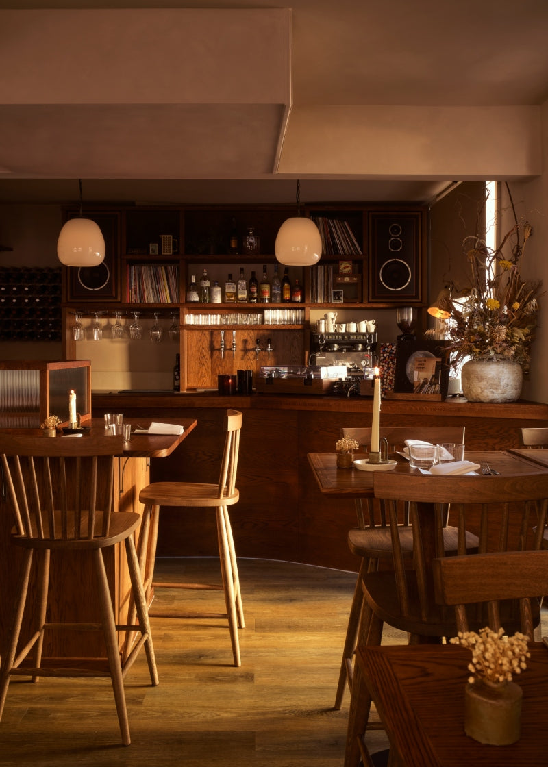 Twenty miles north of London in the city of St Albans, you'll find Hazels—a music-focused independent restaurant offering guests a relaxed dining experience with a seasonal French-inspired menu and handpicked wine list. The interior is elegant and warm, with our wooden Scandinavian Mandal High Chairs in dark oak crafted to match the high-top tables. This sophisticated color creates an intimate and inviting ambiance.