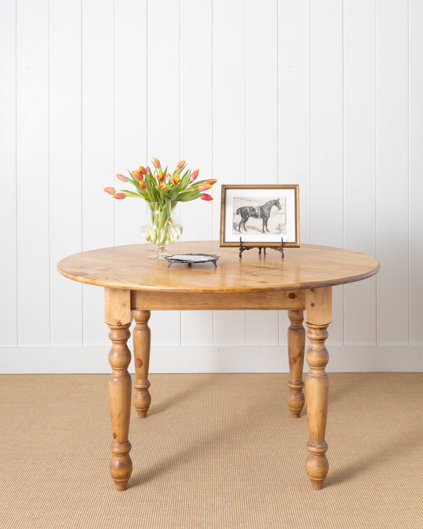 Our years of collecting English antiques led us to design this classic country-style dining table that blends features of antique tables into its construction. This handmade table, crafted with detailed joinery and a reclaimed pine top, showcases quality workmanship and a custom finish that mirrors the style and patina of our antique pieces.